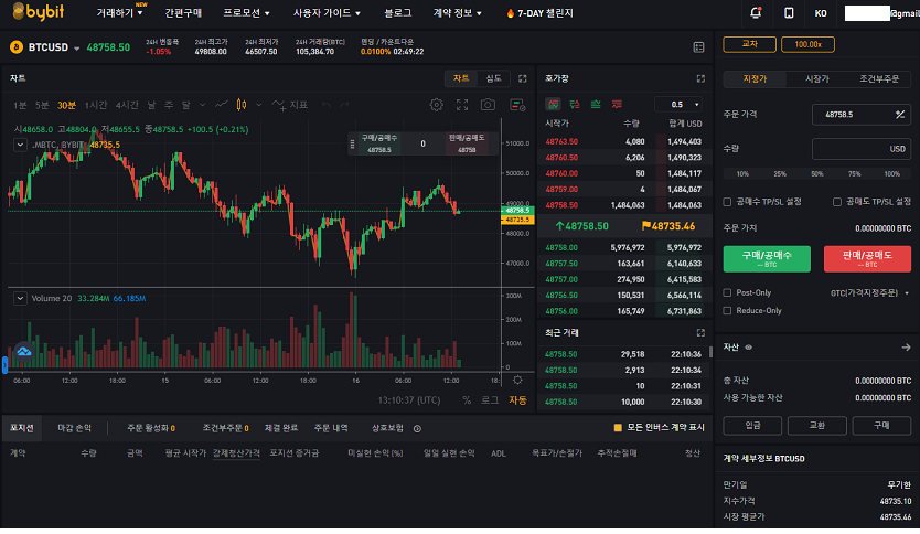국내거래소처럼 원화입금은 안되고, 국내거래소 업X, 빗X에서 코인을 구입후 바이비트 지갑으로 구매한 코인을 전송후 이용하셔야 합니다. 바이비트 장점은 상승장에서도 하락장에서도 횡보장에서도 레버리지를 통하여 수익을 낼수 있다는 장점이 있습니다.